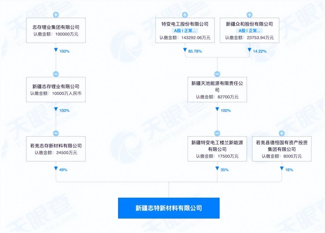 據天眼查顯示,新疆志特新材料有限公司成立于2022年11月7日,若羌志存新材料有限公司持股49%,新疆特變電工(gōng)樓蘭新能(néng)源有限公司持股35%,若羌縣德恒國有資産投資集團有限公司持股16%。