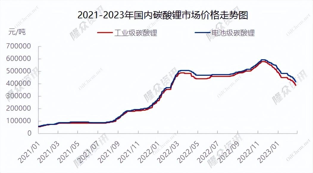 據上(shàng)海鋼聯數據顯示,2月23日,電池級碳酸锂跌7500元/噸,均價報(bào)41.5萬元/噸;工(gōng)業級碳酸锂跌10000元/噸,均價報(bào)38.5萬元/噸。其中,電池級碳酸锂當前報(bào)價相比2022年11月每噸60萬元的高(gāo)點,跌幅超過30%。
