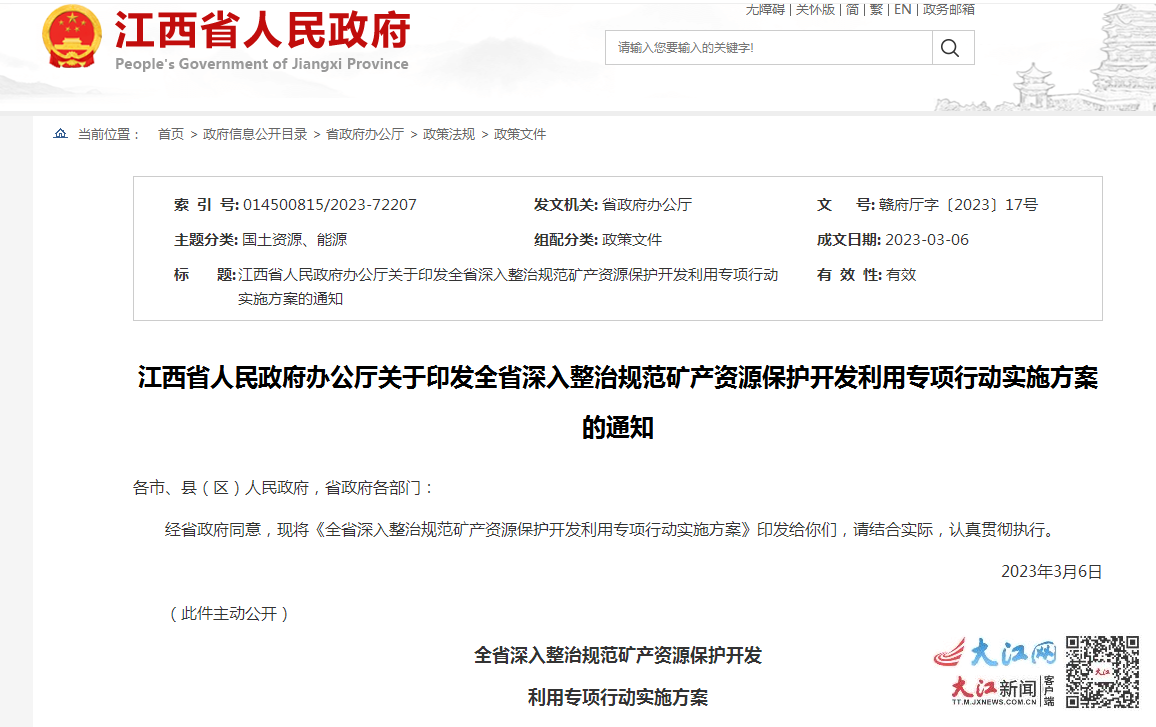 日前,江西省人民政府在其官方網站(zhàn)上(shàng)發布了(le)《全省深入整治規範礦産資源保護開(kāi)發利用(yòng)專項行動實施方案》(下(xià)稱《方案》),從(cóng)礦業權設置審批、礦山開(kāi)采監管、規範礦山企業經營、礦山生态修複、建設綠色礦山、礦山安全生産和(hé)産業鏈供應鏈安全等方面提出了(le)六大(dà)措施,深入整治規範礦産資源保護開(kāi)發利用(yòng)。