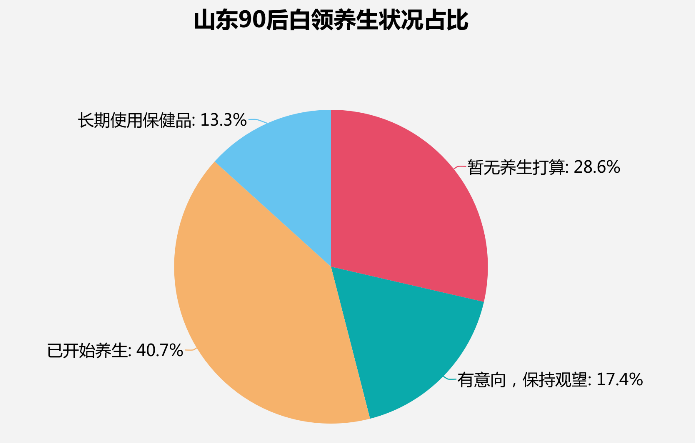 據統計(jì),現(xiàn)如今中國有一大(dà)部分年輕人都開(kāi)始注重養生,且山東省90後已經有過半年輕人開(kāi)始養生。下(xià)圖爲山東90後白(bái)領養生狀況占比,據調查顯示,已有40.7%的白(bái)領開(kāi)始養生;更有13.3%白(bái)領表示長期在使用(yòng)保健品;有17.4%的白(bái)領意向養生并持觀望态度;僅有28.6%的白(bái)領表示無養生打算(suàn)。