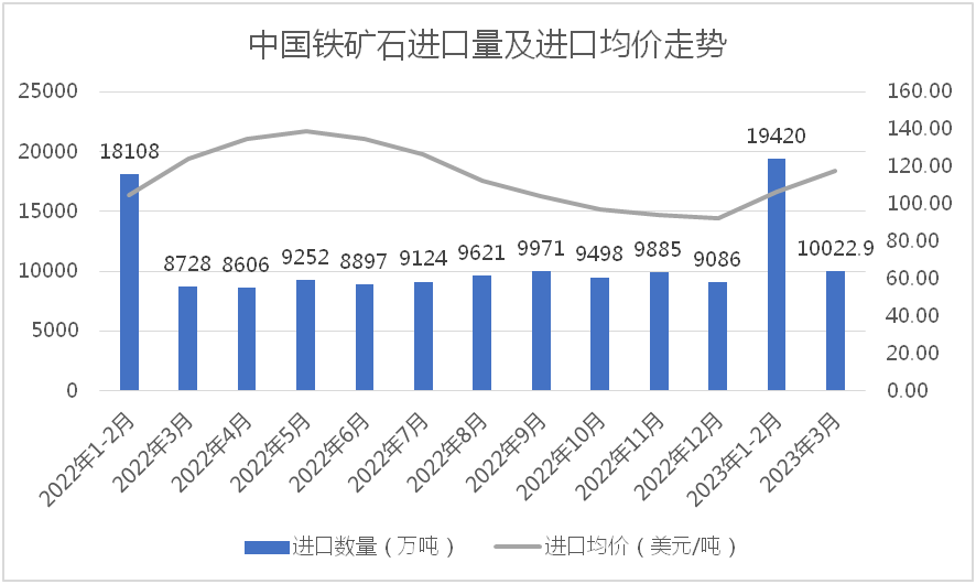據海關總署數據顯示,2023年1-3月份,我國累計(jì)進口鐵(tiě)礦石29433.5萬噸,同比增長9.8%,進口均價110.6美(měi)元/噸,同比下(xià)降12.0%。但(dàn)值得注意的是,今年3月份,我國進口鐵(tiě)礦石量價齊升,單月進口鐵(tiě)礦石達到(dào)10022.9萬噸,同比增長14.8%,進口均價爲117.7美(měi)元/噸,較今年1-2月均價上(shàng)漲11.43美(měi)元/噸,增長10.76%。
