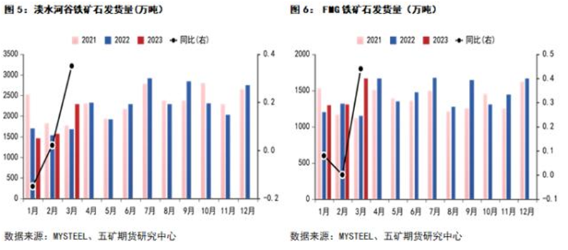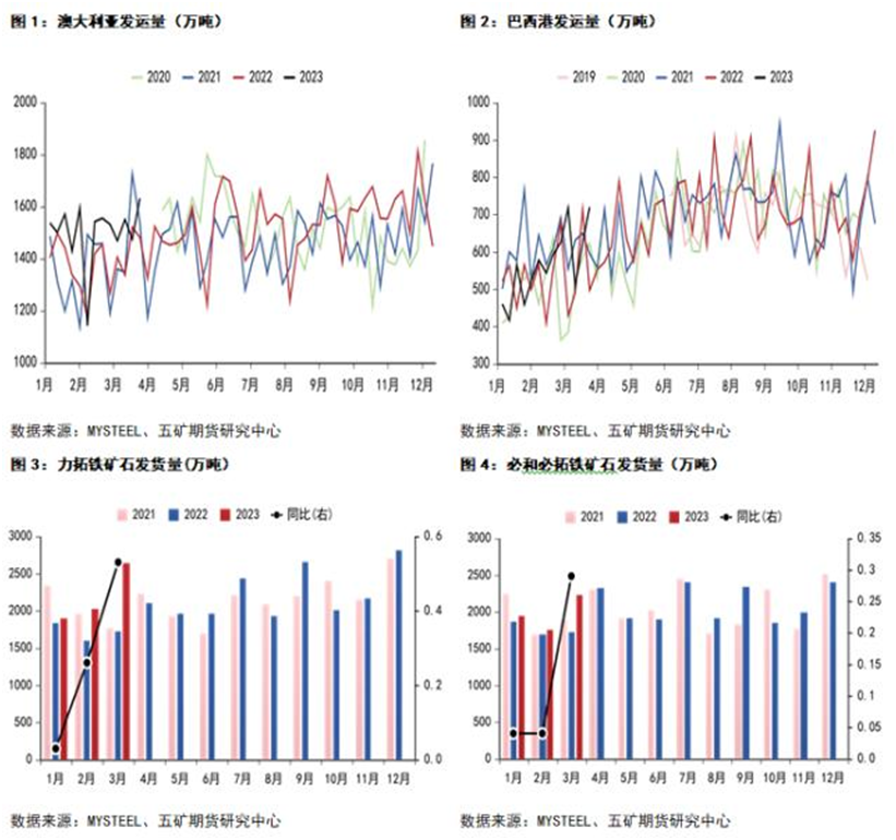 據mysteel和(hé)五礦期貨統計(jì),四大(dà)礦山3月份發貨數據同比大(dà)幅增加。3月份力拓發貨量2595.6萬噸,同比增加50%;必和(hé)必拓發貨量2152萬噸,同比增加25%。淡水(shuǐ)河(hé)谷發貨量2189.4萬噸,同比增加30%;FMG發貨量1622.3萬噸,同比增加41%。