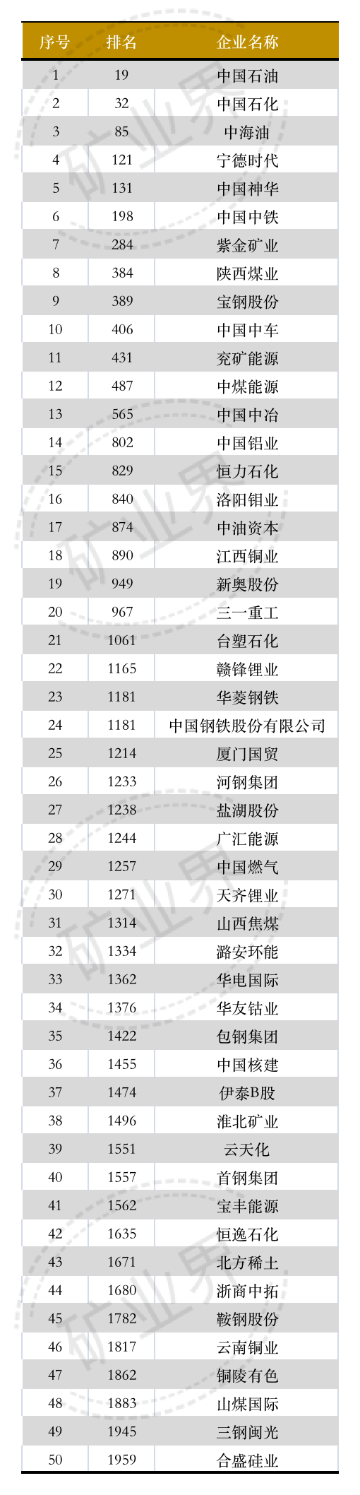 整理(lǐ)發現(xiàn),上(shàng)榜的中國礦業相關企業共有50家,中國石油、中國石化和(hé)中海油這(zhè)“三桶油”與上(shàng)年相比,依然穩坐(zuò)中國礦業相關企業前三甲寶座。其中,中海油排名升幅最大(dà),從(cóng)去年第133位升至今年第85位 。