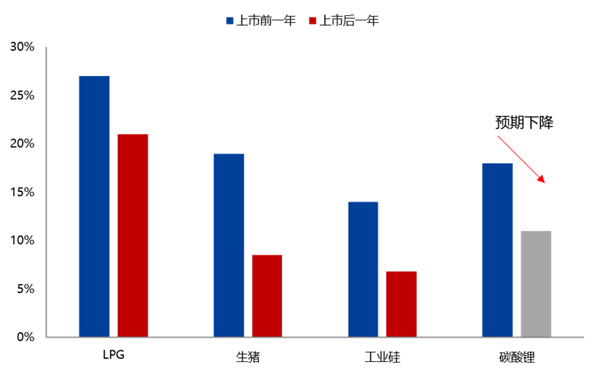 據相期貨公司預測,參考最近三年新增的品種LPG、生豬和(hé)工(gōng)業矽,上(shàng)市後曆史波動率均值較之前明(míng)顯下(xià)降。最近一年電池級碳酸锂曆史波動率均值爲18%,期貨上(shàng)市後預計(jì)逐步下(xià)降至11%左右。