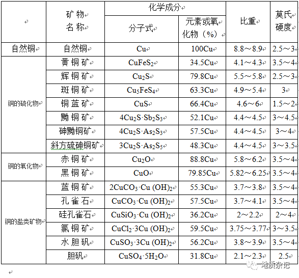 自(zì)然銅;銅的硫化物:黃銅礦(含銅34.6%)、斑銅礦(63.3%)、輝銅礦(79.9%)、銅藍(66.5%)、方黃銅礦(23.4%)、黝銅礦(46.7%)、砷黝銅礦(52.7%)、硫砷銅礦(48.4%);