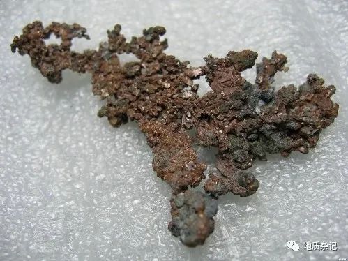 成分Cu,原生自(zì)然銅成分中有時(shí)含銀和(hé)金(jīn)等。等軸晶系。晶體呈立方體,但(dàn)少見;一般呈樹枝狀、片狀或緻密塊狀集合體。銅紅(hóng)色,表面易氧化成褐黑色。條痕呈光亮(liàng)的銅紅(hóng)色。金(jīn)屬光澤。硬度2.5~3。具強延展性。斷口呈鋸齒狀。爲電和(hé)熱的良導體。密度8.5~8.9g/cm3。
