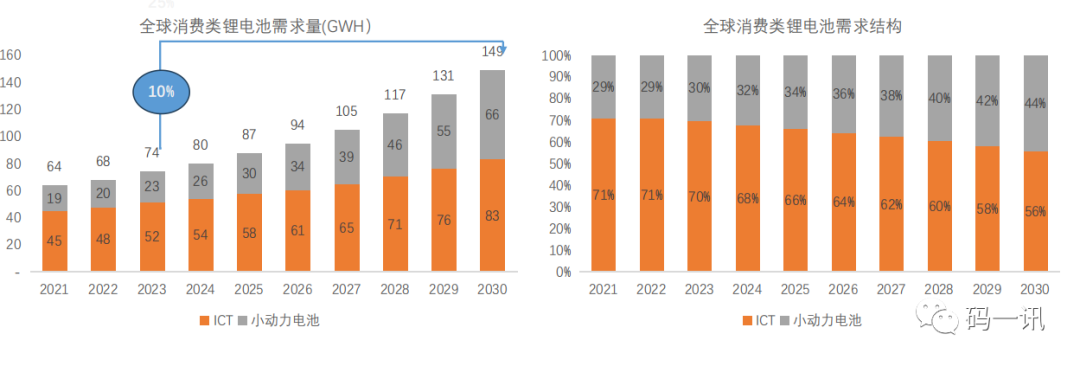 參考多個機構數據,未來(lái)消費類電池需求以10%增速發展,預計(jì)30年總體需求144GWh, 其中ICT占56%份額,小(xiǎo)型動力電池44%;