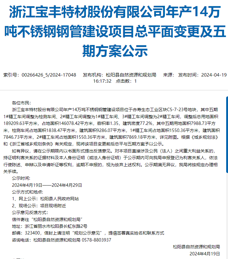 4月19日,麗(lì)水(shuǐ)市松陽縣人民政府發布,松陽縣自(zì)然資源和(hé)規劃局就浙江寶豐特材股份有限公司年産14萬噸不鏽鋼鋼管建設項目總平面變更及五期方案對(duì)外(wài)進行公示,公示時(shí)間:2024年4月19日-2024年4月29日。
