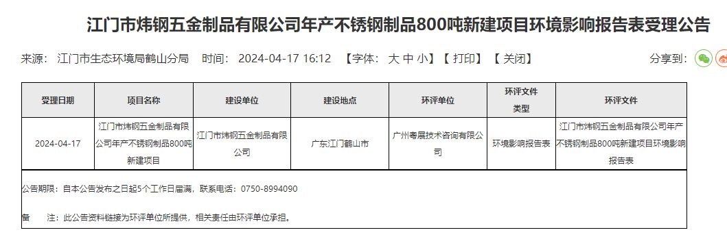 鶴山市人民政府消息,4月17日,江門(mén)市生态環境局鶴山分局受理(lǐ)江門(mén)市炜鋼五金(jīn)制品有限公司年産不鏽鋼制品800噸新建項目環境影響報(bào)告表并對(duì)外(wài)進行公告,公告期:5個工(gōng)作(zuò)日。