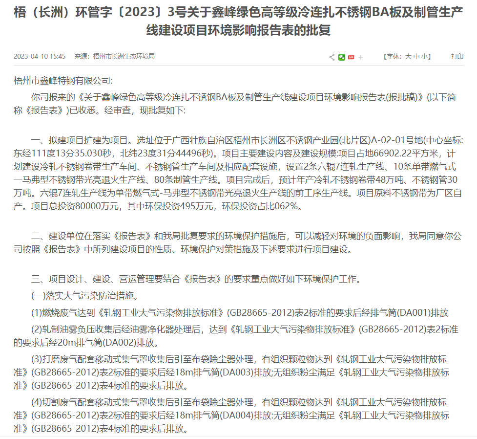 梧州市長洲生态環境局就鑫峰綠色高(gāo)等級冷連紮不鏽鋼BA闆及制管生産線建設項目環境影響報(bào)告表作(zuò)出批複意見。
