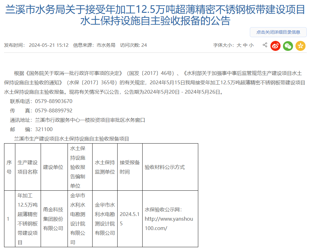 5月21日,蘭溪市水(shuǐ)務局接受浙江甬金(jīn)科技集團股份有限公司年加工(gōng)12.5萬噸超薄精密不鏽鋼闆帶建設項目水(shuǐ)土保持設施自(zì)主驗收報(bào)備并對(duì)外(wài)進行公告,公告期:2024年5月20日-2024年5月26日。