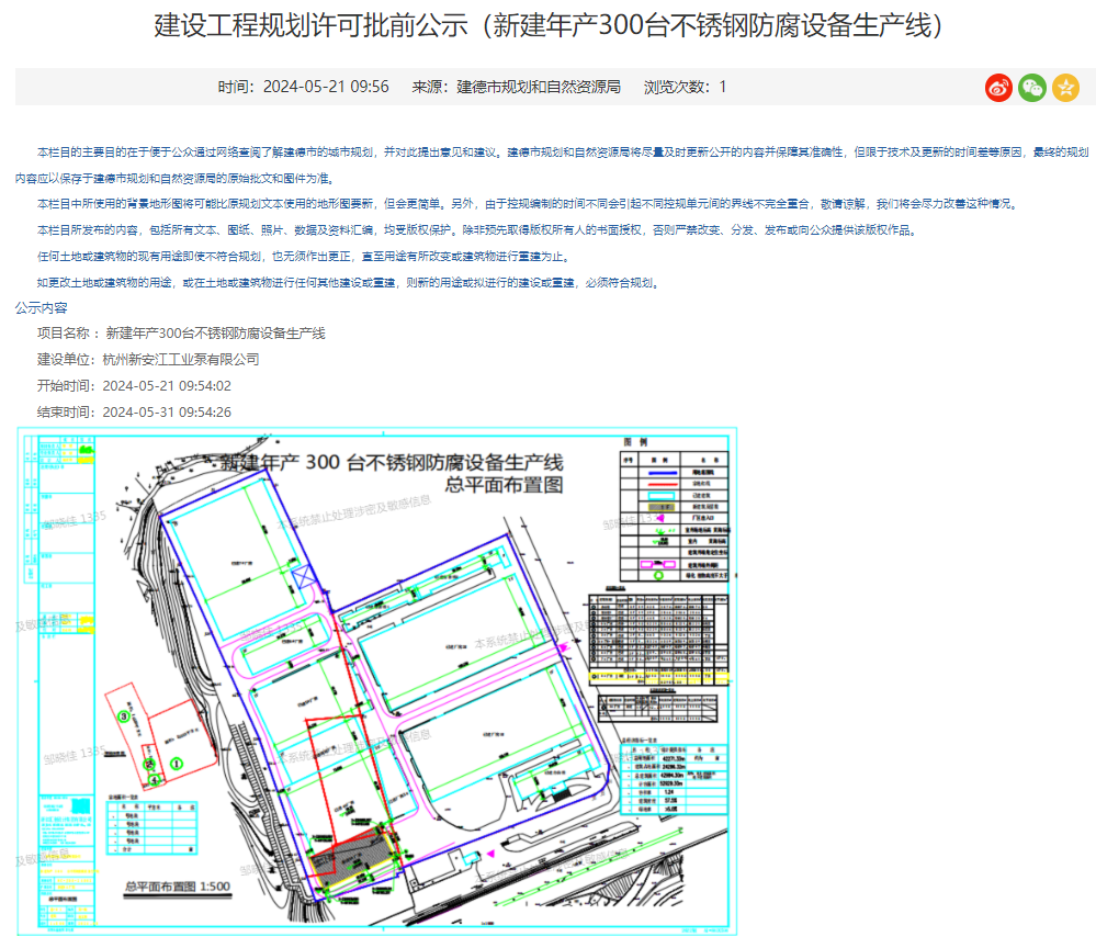 建德市人民政府消息,5月21日,建德市規劃和(hé)自(zì)然資源局就杭州新安江工(gōng)業泵有限公司新建年産300台不鏽鋼防腐設備生産線建設工(gōng)程規劃許可進行批前公示,公示期:5月21-31日。