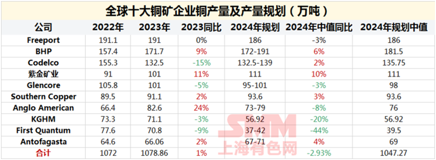 統計(jì)2023年全球十大(dà)龍頭礦企的産量數據顯示,智利國家銅業公司Codelco2023年産量降幅高(gāo)達15%,第一量子First Quantum下(xià)降9%,嘉能(néng)可Glencore和(hé)波蘭KGHM産量分别下(xià)降5%和(hé)3%。據計(jì)算(suàn),十大(dà)龍頭礦企2023年總産量增幅僅爲1%。
