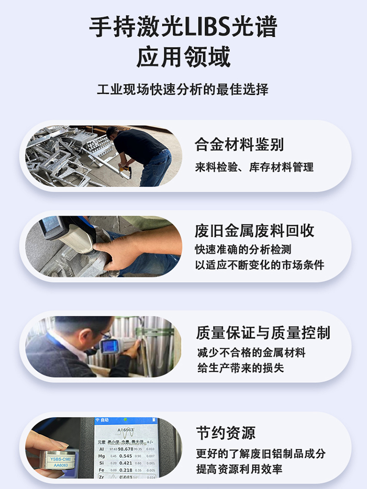 手持式激光誘導擊穿光譜儀利用(yòng)激光誘導擊穿技術,通過激光在樣品表面産生的等離子體,分析樣品中元素的含量。相比傳統的檢測方法,手持式激光誘導擊穿光譜儀具有檢測速度快(kuài)、準确性高(gāo)、操作(zuò)簡便等優點。使用(yòng)者隻需将儀器對(duì)準待檢測的輕質合金(jīn)樣品,即可在幾秒鐘(zhōng)内獲取到(dào)樣品的成分信息,極大(dà)地提高(gāo)了(le)檢測效率。